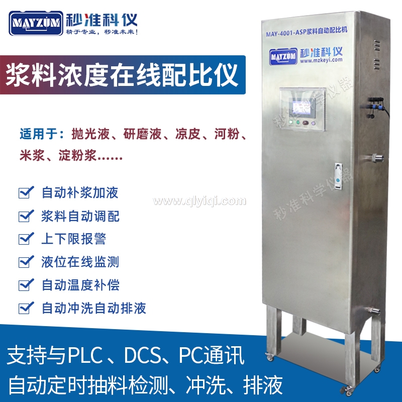 智能漿料波美濃度在線監控儀 一、簡介:秒準智能漿料波美濃度在線監控儀MAY-4001-ASP可以用來在線測量如:淀粉漿、面粉漿、涼皮漿、陶瓷釉漿、泥漿、拋光液、研磨液、粉劑型助焊劑等各種中等粘度的懸浮液體的波美度、比重濃度,內置的測量感應器采用316L不銹鋼加工而成,符合食品衛生標準,在食品加工、陶瓷酒瓶生產、礦場、拋光、研磨等行業中具有廣泛應用。本設備專門設計了自動抽料、自動抽清水沖洗、自動排液的接口,系統運行后會按用戶設定的抽料時間先檢測料的波美濃度,檢測完后再自動抽清水沖洗泵腔、測量管路、測量探頭;沖洗完成后系統會自動打開排液閥將管路中多余的液體排出,排完液后再進入下一輪抽料檢測、沖洗、排液流程。本設備自動抽料檢測、沖洗、排液的工作流程,使測量容易沉淀、具有一定黏附性的懸浮液體變得更加方便,測量數據也更為準確,同時也能符合食品加工廠對衛生方面的要求。 本設備自帶溫度檢測和溫度自動補嘗功能,可消除溫度變化對波美度測量帶去的影響。系統除了基本的波美濃度檢測功能外,還預留了其他功能拓展接口,可以實現自動漿料濃度配比、配完料后打開泵送料的功能,能極大方便用戶的現場使用。儀表的顯示控制