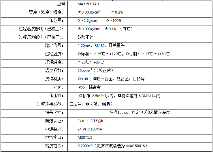 一、工作原理:MAY-5001AH在線螯合劑密度濃度計,是使用聲波頻率信號源對金屬進行激勵,并使叉體處于中心頻率下自由振動,此頻率與接觸液體的密度有著相聯對應關系,因而通過對頻率的分析可測量液體的密度,再進行溫補可消除系統的溫漂;而螯合劑濃度則根據對應液體密度和濃度的關系式可計算出25℃溫度下的濃度值。