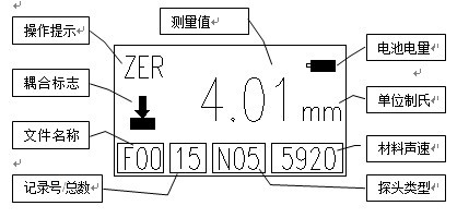 操作提示:當前正在進行的操作或工作模式(FIL:文件選擇; 號MEM:讀取已存儲的數據; PRB: 選擇探頭類型; VEL: 設置聲速; CAL: 聲速校準狀態; DPC: 兩點校準狀態; ZER:探頭校零)